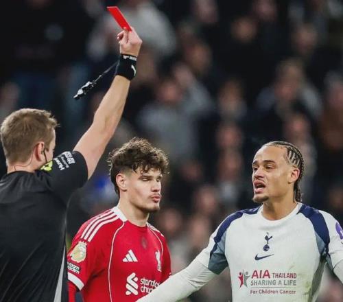 这场比赛的戏剧性,从第30分钟就注定拉满。热刺10号哈维·西蒙斯在逼抢中蹬踏范戴克小腿,主裁判先出示黄牌,经VAR介入后改判直红罚下。这本该是利物浦掌控全局的开始,却没想到成了“混乱模式”的启动键。补时阶段,罗梅罗拼抢后的附加动作吃到第二张黄牌,两黄变一红离场,热刺就此沦为9人作战。数据统计显示,这是2007年10月以来,首支在对阵利物浦的英超比赛中吃到两张红牌的球队,热刺用最鲁莽的方式,续写了对红军的悲情历史。
